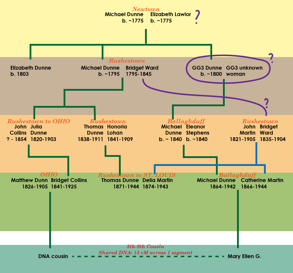 - Hypothesis 1. MICHAEL DUNNE (b. ~1795) had a brother “GG3,” who fathered MICHAEL DUNNE (b. ~1840) of Ballaghduff. I have found the baptismal record for a sister Elizabeth, but no other clues emerge. In this scenario, my great-grandfather MICHAEL DUNNE and St. Louis’ THOMAS DUNNE are second cousins.