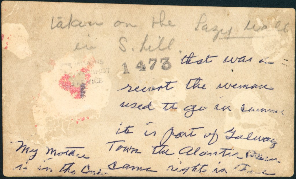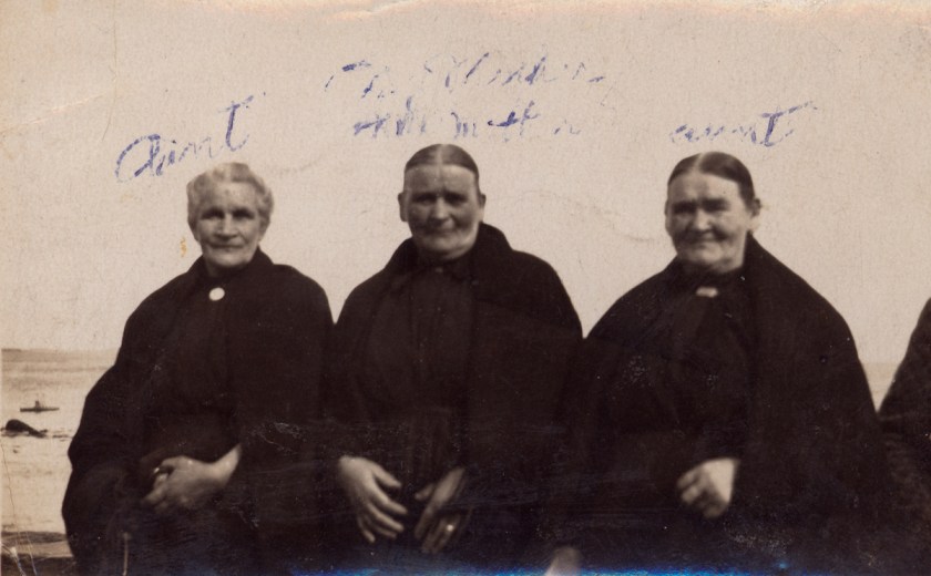 The photo above was taken at the Salthill seaside resort, on Galway Bay in Galway City, where the family matriarchs took an annual summer holiday. On the back is an early label, plus an added description by Bridget Dunne Price. L-R, we have Honoria Martin Crehan (1868-1949), Catherine Martin Dunne (1866-1944), and Mary Martin Coughlin (1872-1947).