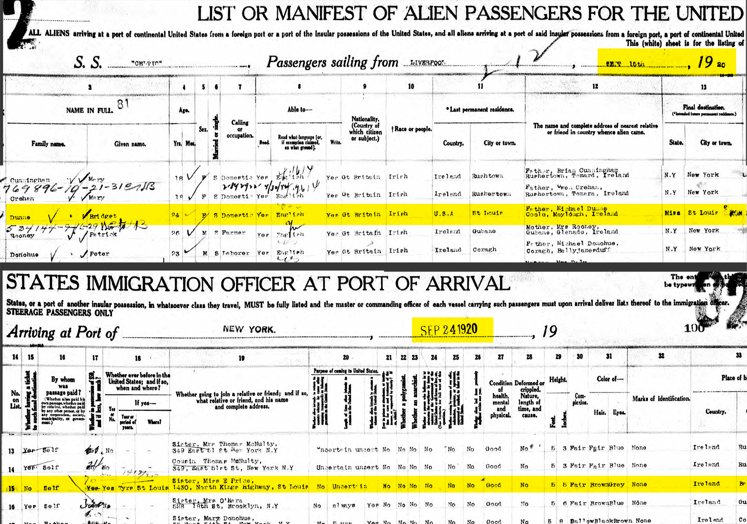 But now a ship’s record confirms my dad’s childhood snooping. While I can’t find a record of her returning to Ireland, this record shows her coming back, on the SS Celtic, which arrived in the port of New York on 24 Sept 1920. According to the record, she paid for her own passage and was “uncertain” about how long she would stay. Did her family know her condition? Did she want to stay in Ireland? Did the family insist she return to St. Louis? The answers are lost in the mist of time.