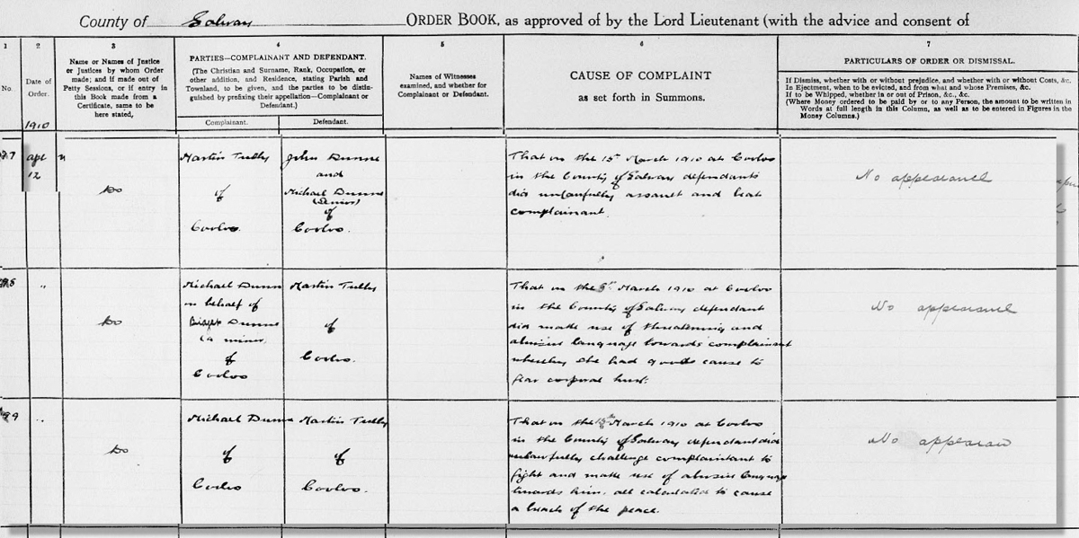 Looks like Tully got abusive toward young Bridget and her father and brother came to her defense. In any event, neither party showed up for the 10 April court date, so they probably sorted out their differences in the interim.