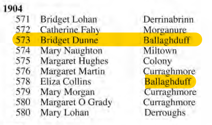 1904. At age 10, Bridget enrolled in the Curraghmore National School, along with her village-mates Eliza, James, and Patrick Collins.